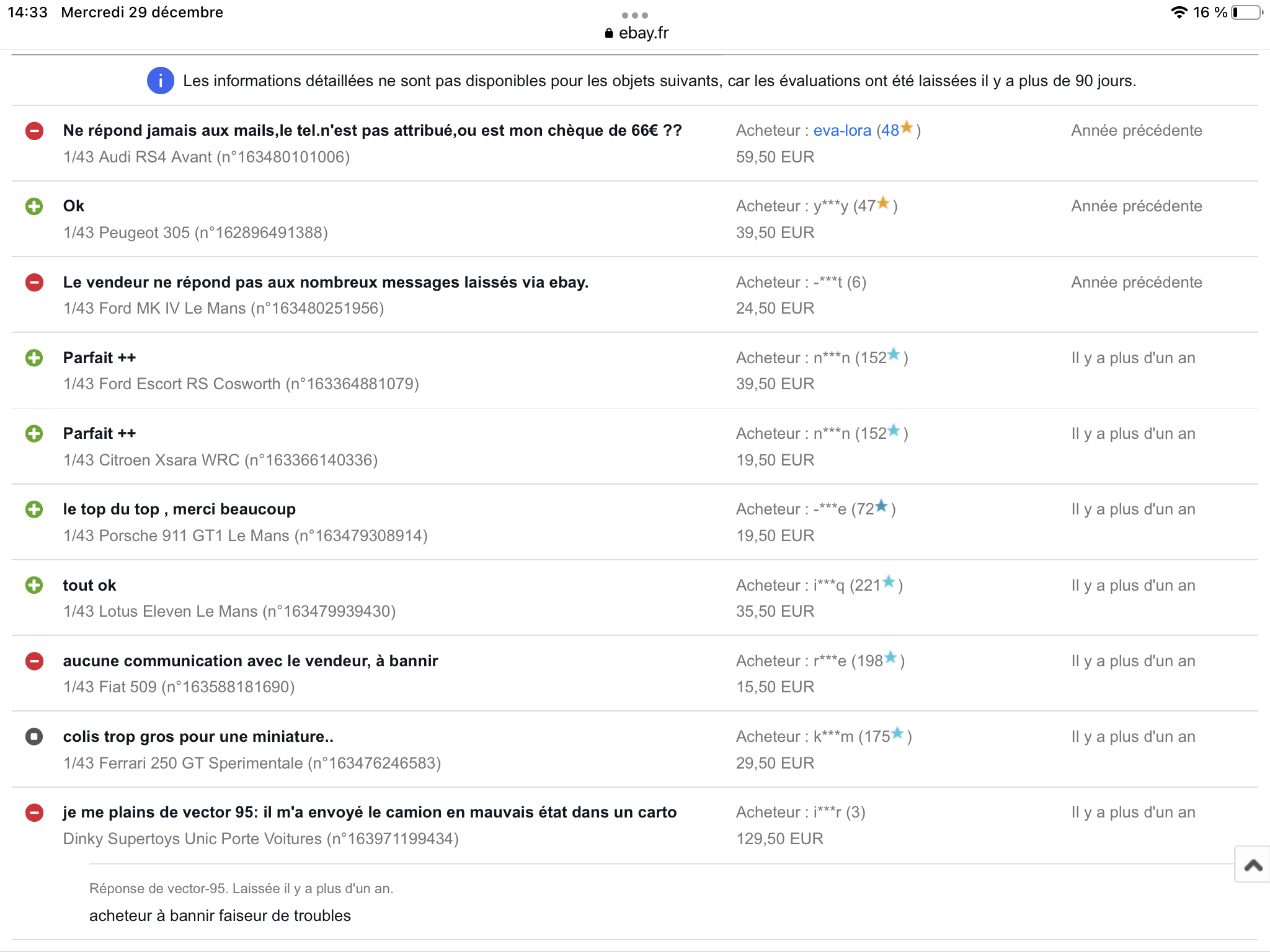Déjà ce site s’auto-ėvalu , comme ça il est sûr de recevoir ses cinq étoiles, chose qu’ il n’aura probablement pas à chaque fois. Je me permet de le juger car il y a un an , j’ai eu l’ occasion de commander une miniature à ce pseudo-vendeur. Je précise qu’il a depuis disparu de la circulation sur le site qui hébergeait ses annonces (ebay pour ne pas le citer) , tellement nombre de ses dernières évaluations étaient mauvaises. Je joins des captures d’écran pour étayer mes dires. J’ai donc commandé en Décembre dernier une miniature et envoyé un chèque de 66€ à celui qui se faisait appeler « vector-95 » à l’ époque, je n’ ai bien sûr jamais rien reçu, ni miniature ni réponse à mes nombreux messages sur la messagerie ebay ou sur sa boîte mail, le numéro de téléphone renseigné dans l’ annonce étant quant à lui non attribué ! Outre le temps perdu, il a fallu en plus que je fasse opposition au chèque. Quant à la miniature convoitée à l’époque , parce qu’il ne l’a toujours pas vendue (Audi RS4 rouge) , elle est passée de 59€50 à 120€ en un an ! Je l’ai d’ailleurs retrouvée à un tarif bien plus abordable depuis. Voilà mon évaluation était laborieuse mais je voulais partager mon expérience avec les éventuels acheteurs de ce site qui ne m’a pas du tout convaincu